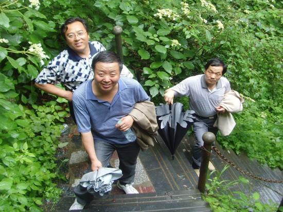 穿过禅林,走过中峰,贵清山最具标志性的景点——断涧仙桥跃入眼帘。放眼望去,一座古廊悬架于两座峭壁之间,悬而壮观,真乃人间天桥,让人叹为观止。难怪清朝王宪赞曰:“两崖惊绝涧,千尺跨飞虹。步上青云去,冷然想御风。”站在仙桥,可以目睹万丈沟壑之险峻,倾听阵阵松涛之愉悦,欣赏鸟越群壑之逍遥,感叹群峰拔起之突兀。缓缓行过人间仙道,体验转树险道,惊险别伦。蒙蒙细雨中,我们猫着腰,抱着树干,爬过犬牙似的“回心石”,探头俯视脚下,绝壁悬崖,让人倒吸一口凉气。 赏完山顶风光,我们沿着1288个贵清天梯台阶颤颤而下。身旁的竞秀奇峰婀娜多姿,有的如神态各异的少女;有的恰似刺破晴空的长锷;有的如横空出世的巨蟒;有的像微微欲行的大象……“横看成岭侧成峰,远近高低各不同”。移步换景,沿途到处都是郁郁葱葱的千年云杉,到处都是若隐若现的芳草和野花,百鸟啼鸣,婉转动人。 (图中人:蒋仲良、高庆国、陈具才) 行至半山腰,雾散雨停,视野变得敞亮,心情也更加敞亮。原来看山从低处往上看,方见山之巍峨,顿觉和山是如此相近,近得能用鼻子碰着山,能用双手抚摸着山,能用一掬水洗着山。仰面而视,壁立万仞,剑拔弩张,直插云霄。峡谷两面,奇峰林立,高低错落。细看又觉诧异,天地造化之大手笔,鬼斧神工,真是磅礴不凡之气势。 下得沟底,慢游于长长的贵清峡。山水一脉相连,小溪缠缠绵绵,飞瀑玉珠绽泻,翠峰遮阳闭月。快出峡口,山地渐渐开阔,景色更加迷人,有奇峰作笔林为毫的神笔峰,有百米素练如烟云的云崖飞瀑。林木葱茏,飞瀑如练,泉水叮咚,百鸟鸣啾,奇峰怪石,巧夺天工。10公里神奇的贵清峡,就是10公里长的画廊。 (图中人:李晓红、靳雪萍、王番琴、蒋仲良、尉子惠、王维斌、何耀平、马学峰、高庆国、陈具才) “早知贵清山,何必下江南”,这就是我们在这个人间仙境中的感叹! 下午五点左右,游览完毕。联系接送大巴,方知出了个小事故,只能从渭源另派一辆车来接。无奈,我们从附近的新寺镇找了一家酒店,一边休息、一边晚餐、一边小酌、一边等车。我们闲聊当天的见闻和趣事,也聊三年来工作上的酸甜苦辣,偶尔也有精彩段子笑得大家“人仰马翻”!午夜时分,回到渭源,各自回家。