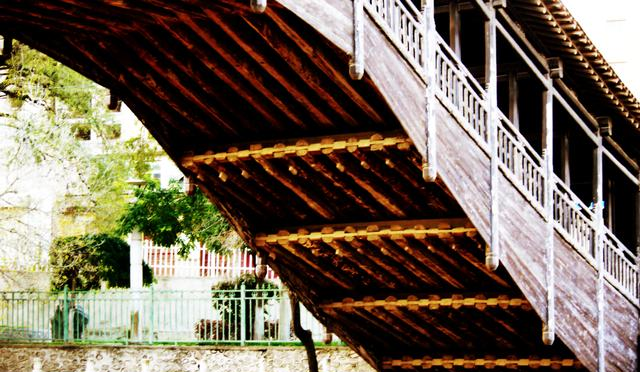 桥顶是飞檐挑阁式,褐檐灰瓦,与两头的卷棚式廊房,还有红褐色的拱形长廊浑然连成一体,弧线优美、巧夺天工、精巧壮观、婀娜飘逸,像一道彩虹静卧在清源河上。