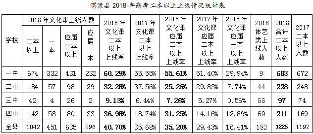 2018年高考,渭源县文化课二本以上共上线1042人(理科841人,文科201人),较上年的1014人净增28人,上线率40.70%,较上年的35.68%净增5.02个百分点,列全市七县区第四名(前三名分别是陇西、临洮、安定)。其中应届生上线635人(理科519人,文科116人),较上年的598人净增37人;上线率35.20%,较上年的29.43%净增5.77个百分点,亦列全市七县区第四名(前三名分别是临洮、陇西、安定)。 加上体艺类考生上线的183人(体育14,音乐93,美术76),全县二本以上共上线1225人,较上年净增33人。 文化课一本共上线451人(理科405人,文科46人),较上年的340人净增111人。上线率17.62%,较上年的11.96%净增5.66个百分点。应届生上线296人(理科272人,文科24人),较上年的238人净增58人,上线率16.41%,较上年的11.71%净增4.7个百分点。 市上下达各县的2018年高考指标都是要求应届文化课考生二本上线率提高2个百分点,我县上线率35.20%,较上年的29.43%净增5.77个百分点,超额3.77个百分点完成了市上任务。