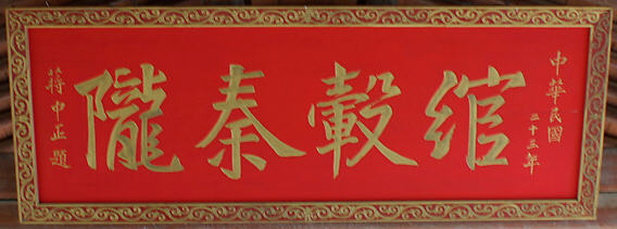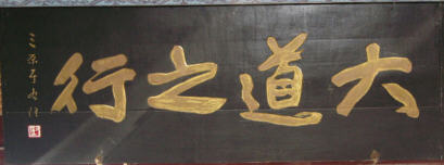 匾额“大道之行”是于右任先生所题。于右任,1879出生,1964去世,陕西三原人,历任国民政府要员,于右任精通书法,尤擅草书,创立了《标准草书》,被誉为“当代草圣”。大道之行出处见于老子《道德经》第八章,是“大同社会”的最高理想,它不仅表明于右任先生希望祖国统一的爱国深情,也是渭河两岸人民的愿望。