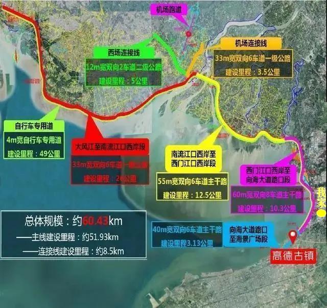 我重点关注的,是离我们最近、目前在建即将竣工、以后我们经常要去散步的海城区路段。从高德古镇(向海大道路口,向海大道即原迎宾大道)到垌尾村,道路全长约6560m、规划红线宽60m,为城市主干道,设计速度为60km/h,投资9.3亿多。