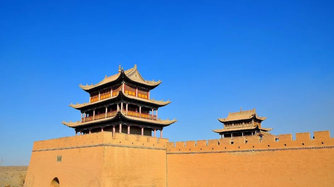 ②嘉峪关长城 嘉峪关长城位于甘肃省嘉峪关市西南隅,因建于嘉峪山麓而得名,是明长城西端起点,建于明洪武五年(1372年),是明长城沿线保存最完整的一座城关,河西第一隘口,也是丝绸之路上的重要一站。城关由内城、外城和城壕组成的完整防御体系,黄土夯筑而成,外包城砖,坚固雄伟。关城平面呈梯形,面积3.35万余平方米,城墙总长733米,高11.7米。