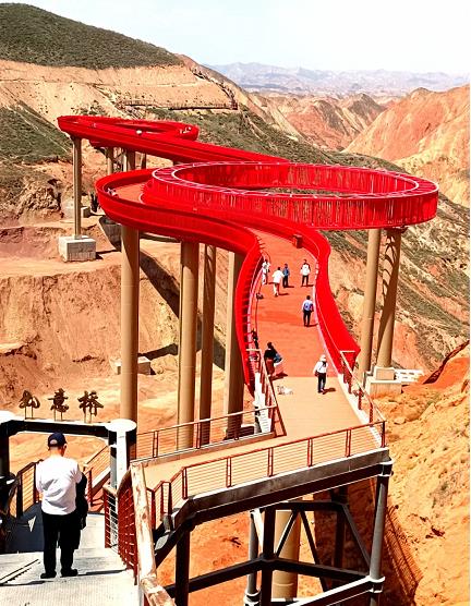 走丹霞栈道必经红色如意桥。桥梁宽度为3.8米,跨越峡谷长度约为200米,颇为壮观。