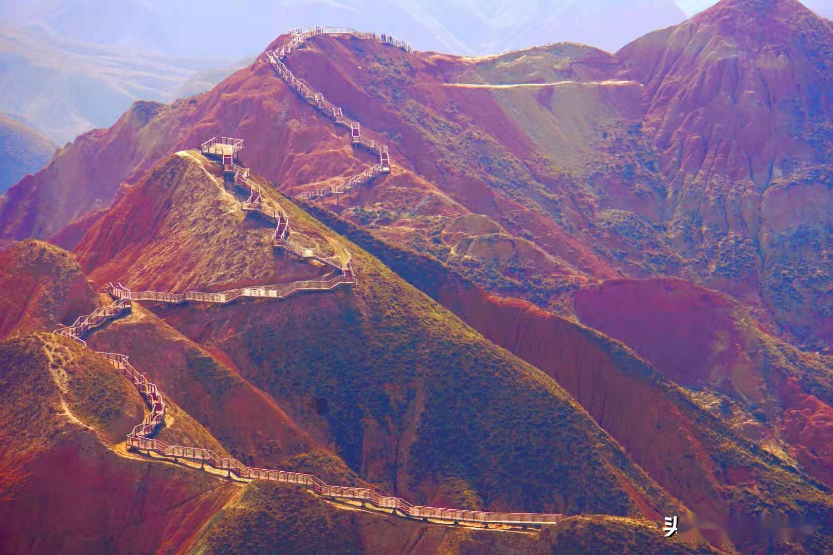 二是丹霞栈道。如果不想走回头路,而是进一步与丹霞群山来个亲密接触,那就要走上丹霞栈道了。丹霞栈道东起“丹顶揽胜”,西到“沙韵驼铃”,全长3.5公里。栈道依山就势,起伏蜿蜒,从远处望去,就像是建在丹霞崖壁上的长城,亦如盘踞于丹霞崖壁上的巨龙,颇为壮观。游客在栈道上移步换景,同时也成为别人眼中美景的点缀。