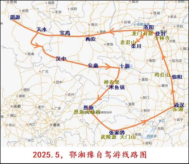 2025年5月12日一早,我们十位驴友(李增龙、段淑芳、赵明学、曹忠贤、王钰、陈具才、牛淑芬、甄立萍、任小惠、陈芳琴),从河南洛阳出发,经西安,长驱920公里,当晚六点半顺利回到甘肃渭源,愉快地完成了一次为期11天的鄂湘豫自驾游。