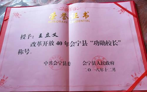 功勋校长评委会的颁奖辞是:陇中腹地是家园,除了大山,还有干旱。走出大山,曾经,也是您的心愿,您却忘不掉山中孩童眼眸中的期盼。拓荒杏坛四十年,几多暑与寒,月缺月又圆。您站立过的地方,喷发出知识的甘泉,魂牵梦萦的那片校园,国旗更加鲜艳。没有选择巨贾高官,虽半生筚路,一世蓝缕,您却无悔无怨,守望着的山川,学风存续,文脉相传。山中的孩子,在您坦然的微笑中,一茬茬长大,考出去了十几万。孩子们的眼中,您就是一座山!