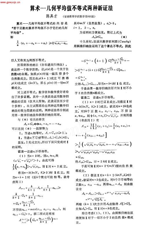 算术-几何平均值不等式两种新证法作者:陈具才 来源:本站原创 (本文发表于《数学教学研究》1988年第3期)