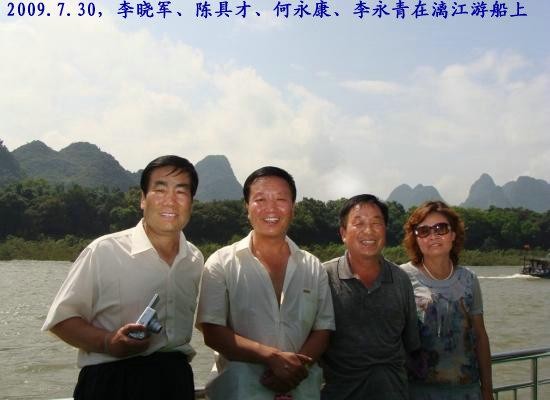 下图是陈具才等于7月30日上午、中午船游漓江,左起:李晓军、陈具才、何永康、李永青