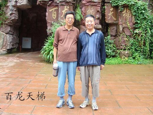 上图是2007年7月26日,中午坐百龙天梯上山游览了张家界风景区著名景点——袁家界。这是何伟军(左)、陈具才在百龙天梯处