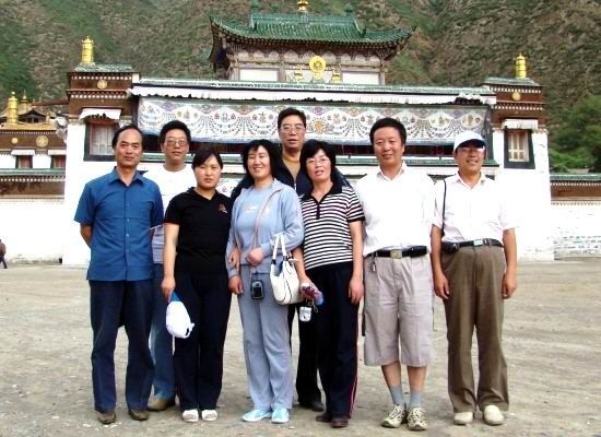 2008.7.20下午渭源一中60人旅行团队游览参观了拉卜楞寺。这是数学小组九人在一起,图中右起:牛立新、陈具才、郭亚琴、何仁权、倪彩兰、刘彩琴、何伟军、曹平原。