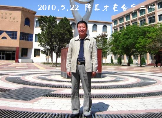2010.5.22,陈具才随渭源一中数名领导考察了会宁二中校园建设情况。上图是陈具才在会宁二中校园的音乐喷泉小广场。