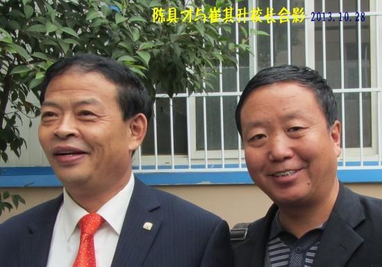 上图是参会人员在杜郎口中学校门口的合影,下图是陈具才与杜郎口中学校长崔其升的合影。