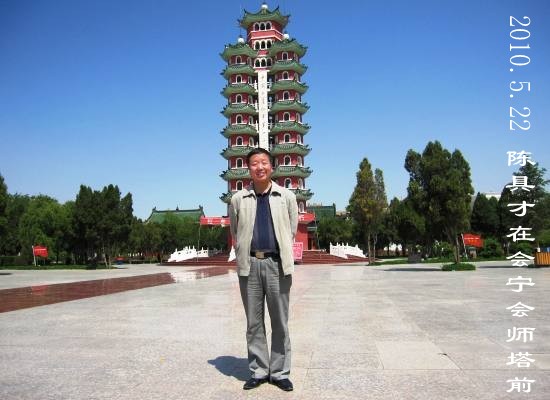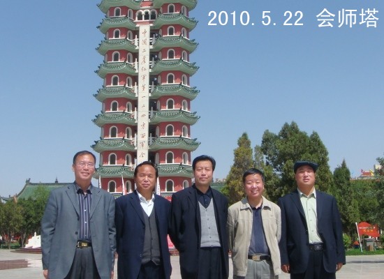 2010.5.22,渭源一中一行数人前往会宁二中考察其校园建设情况,上图是在会宁会师塔前,左起:总务处副主任龚士周,副校长张天斌,校长金雁东,副校长陈具才,司机李继红。 【相关资料】 会宁县位于甘肃省中部,白银市南端,南和通渭县接壤,北与靖远县毗邻,东靠静宁和宁夏的西吉县、海源县,西接定西县和榆中县。整个地形大致可分为梁峁山地、河谷川地和黄土残塬三种类型,海拔2000米以上。据《会宁县志》记载:“会邑地控三边,县居四塞,东跨泾原,南蔽秦陇,西障金城,北控羌戎,古为用武之地,历史之重镇。”史称“秦陇锁钥”。