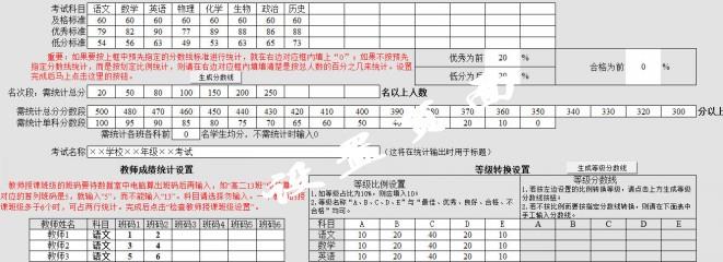 自动统计输出项目:每个学生的总分及各科成绩的排名;总分及各科前n名学生光荣榜;每个班级的各科考试人数,均分,最高最低分,优秀、低分、及格人数及优秀率、低分率、及格率(相应的分数线标准既可预先指定亦可规定百分比由电脑自动生成);总分与各学科的各名次段、分数段的各班人数及上线率;部分学科及所有学科的各班全合人数及全合率;各班前n名学生的均分。还可统计所有任课教师的成绩(均分、及格率、优秀率、低分率)。特别地,还根据教育部的新要求,增加了方便实用的学生成绩等级转换功能!